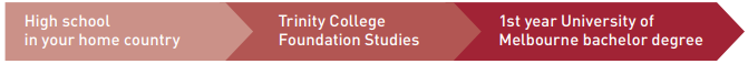 Trường cao đẳng Trinity được thành lập vào năm 1870 dựa trên mô hình cao đẳng Anh Quốc của Oxford và Cambridge. Trinity là trường cao đẳng nội trú liên kết với đại học Melbourne từ năm 1876. Những sinh viên quốc tế tài năng có nguyện vọng học tập tại Đại học Melbourne có thể thực hiện chương trình Dự bị đại học chất lượng xuất sắc (TCFS) Tại Cao Đẳng Trinity. Đại học Melbourne ước tính có khoảng 25% sinh viên quốc tế của bậc đại học đã chuyển tiếp lên từ chương trình dự bị của Trinity.